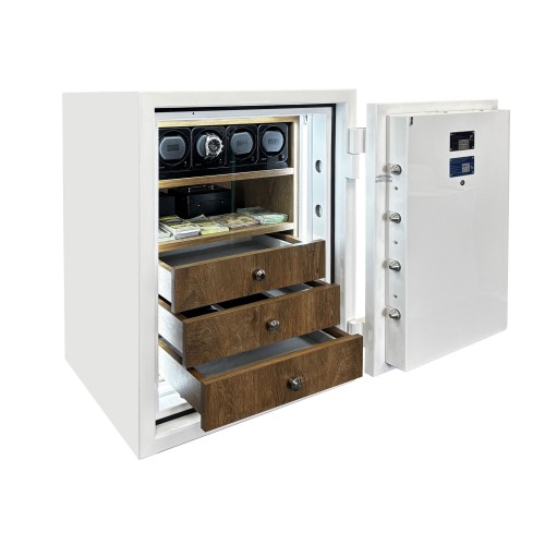 Seif on varustatud kolmeküljelise riivisüsteemi, põrandale kinnitamise võimalusega ning tugevdatud erisulamist terasplaatidega, mis kaitsevad puurimise ja luku välja löömise eest. Läikiv valge viimistlus ja peen sisekujundus sulanduvad kaunilt luksuslikku interjööri.